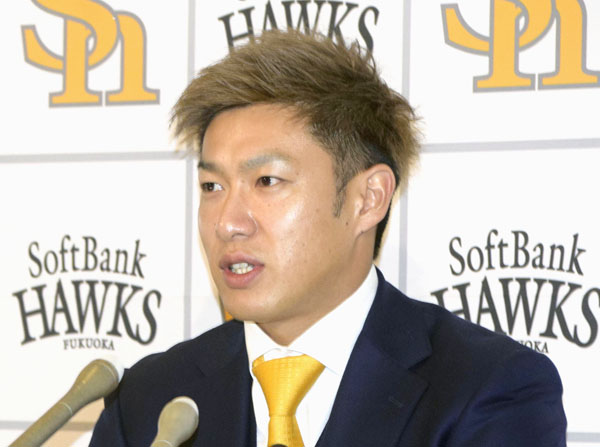7年の契約更改交渉を終え、記者会見するソフトバンクの柳田(C)共同通信社