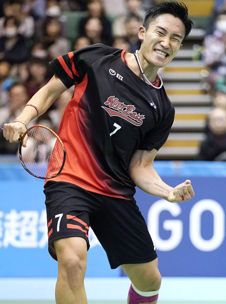 全日本総合バドミントン選手権・男子シングルス決勝で勝利しガッツポーズする桃田賢斗(C)共同通信社