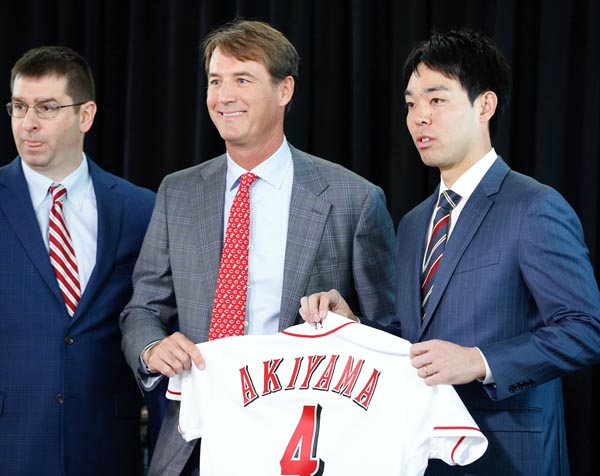 レッズのウィリアムズ編成本部長(中央)らと入団会見をする秋山翔吾(C)ロイター/USA TODAY Sports