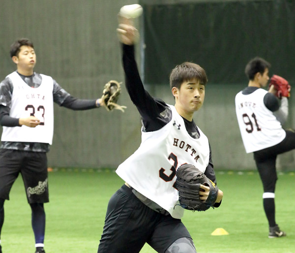 しなやかなフォームの堀田(後方は太田と井上=右)/(C)日刊ゲンダイ