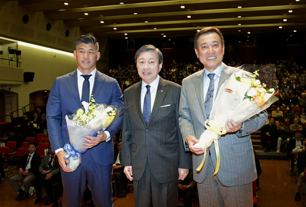 東海大で講演を行った原監督(右=左から井上監督、山田学長)/(C)共同通信社