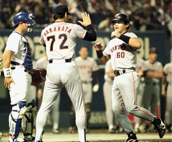 94年、中日との「10・8」決戦で先制本塁打を放つ落合(右)/(C)共同通信社