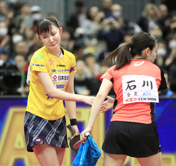 念願の初優勝を飾った早田ひな(左)と石川佳純(C)共同通信社
