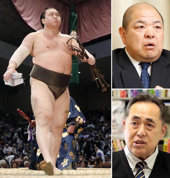 八角理事長(右上)と芝田山広報部長(同下)(C)共同通信社