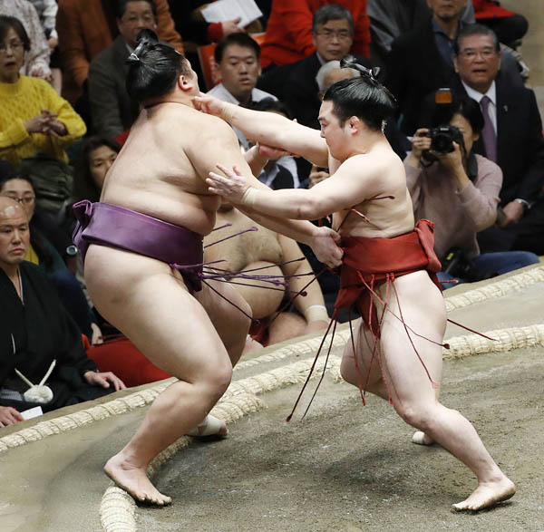 11日目は朝乃山(左)を押し出しで破った炎鵬(C)共同通信社