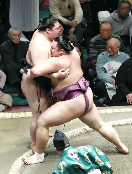 朝乃山(右)に寄り切られた12日目、大関から陥落(C)共同通信社