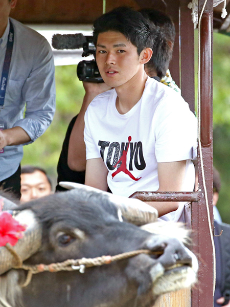 ナイキのTシャツを着て水牛観光を楽しむ佐々木(C)日刊ゲンダイ