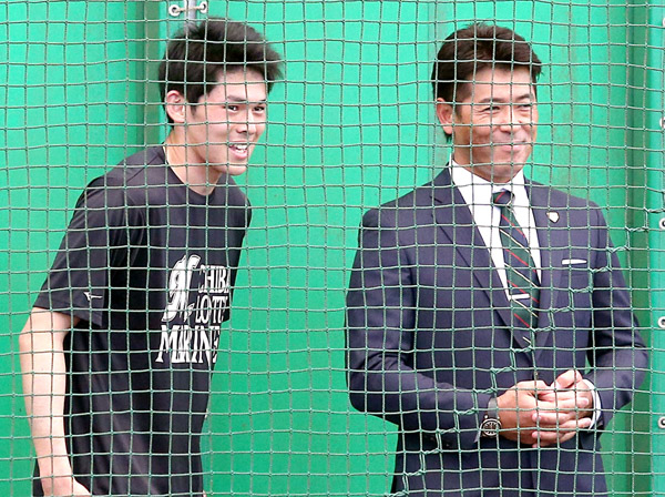 視察に訪れた侍ジャパンの稲葉監督(右)と話をする佐々木(C)日刊ゲンダイ