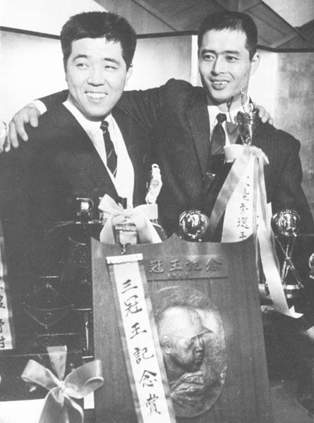 プロ野球両リーグ・個人タイトル表彰式で肩を組む巨人・王貞治と南海・野村克也両選手。入団12年目の野村は戦後初の三冠王を獲得、7年目の王は本塁打と打点がトップで、共にリーグMVPに選ばれた=1965年11月(C)共同通信社