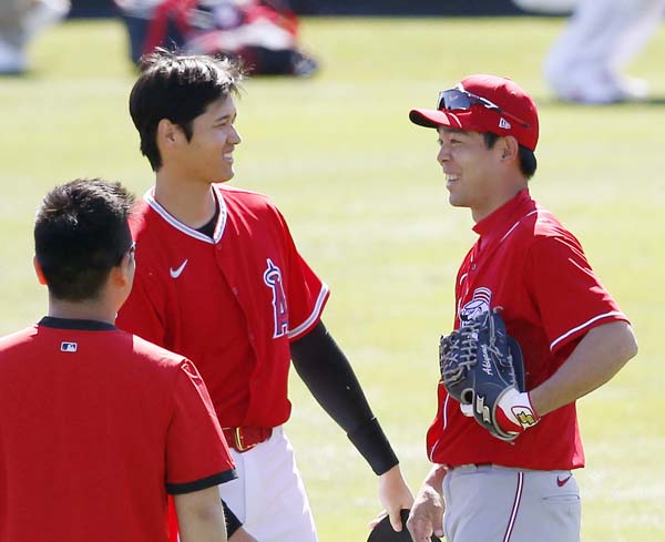 試合前に大谷(左)と談笑する秋山(C)共同通信社