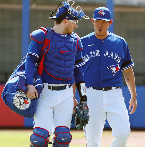 ジャンセン捕手と話す山口(C)ロイター/USA TODAY Sports