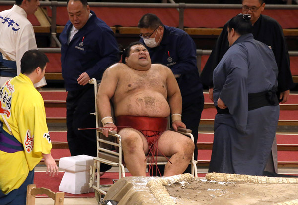鶴竜に突き落としで敗れ、苦痛の表情で車椅子に座る高安(C)日刊ゲンダイ