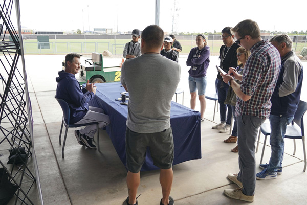 新型コロナウイルスの感染拡大防止策で、監督室の外で記者会見するマリナーズのサービス監督(左)=10日、ピオリア(C)共同通信社