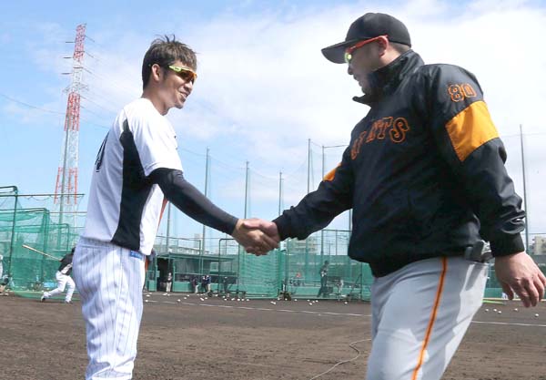 巨人・阿部二軍監督と握手を交わす鳥谷(左)/(C)日刊ゲンダイ