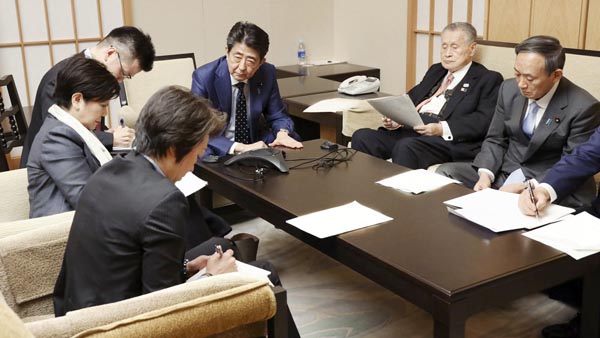 IOCのバッハ会長と会談する安倍首相、森組織委員会会長、菅官房長官、橋本五輪相、小池百合子東京都知事ら(内閣広報室提供)