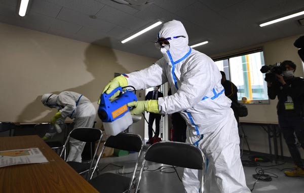阪神の二軍施設で行われた消毒作業(C)共同通信社