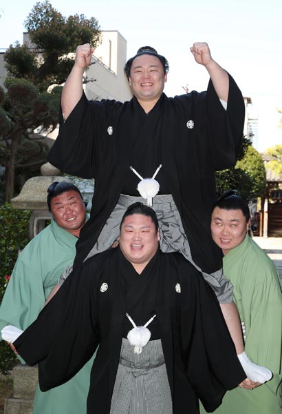 若手力士らに担がれ笑顔を見せる朝乃山(C)共同通信社