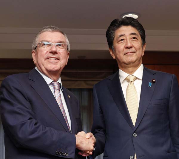 安倍首相がバッハ会長(左)に延期を提案しただけに…(C)共同通信社