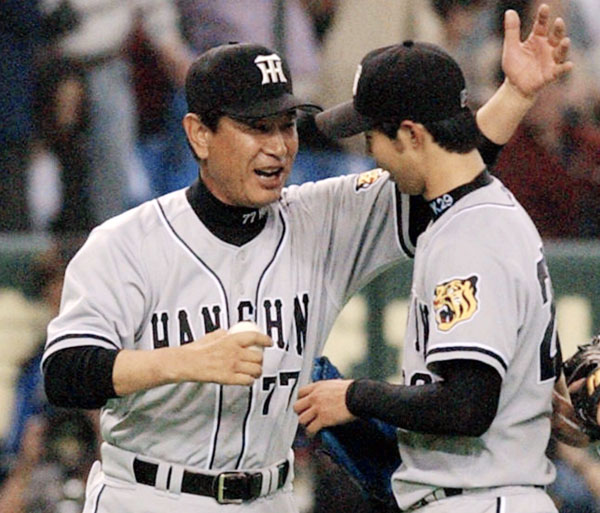 12年ぶりの開幕勝利に井川投手を迎える星野監督は表情(=2002年開幕戦・対巨人戦で)/(C)共同通信社