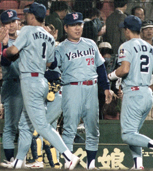 野村監督に迎えられる筆者(右)/(C)共同通信社