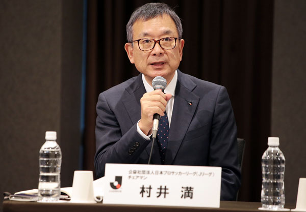 ビデオ会議システムによるメディアとの会見で語る村井チェアマン(提供写真)