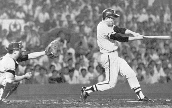 甲子園の巨人戦で先制本塁打を放った山内一弘(C)共同通信社