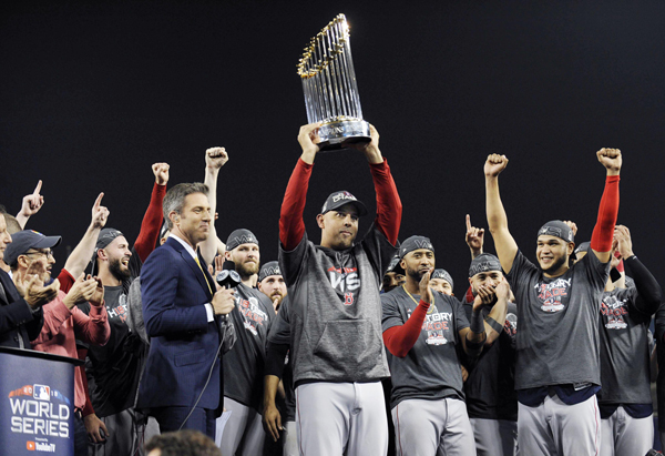 2018年のワールドシリーズを制してトロフィーを掲げるコーラ監督(C)USA TODAY・ロイター=共同