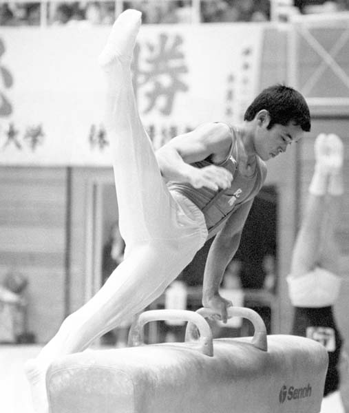 1981年の全日本体操選手権初日、男子規定で首位に立った梶谷信之のあん馬の演技(C)共同通信社