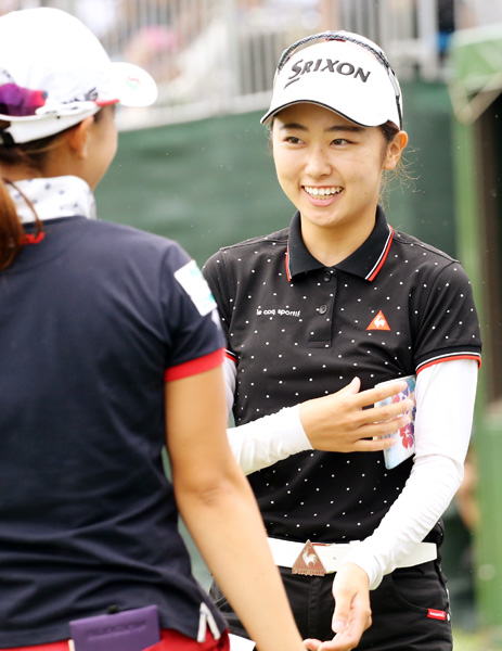 渋野から祝福され笑顔の安田祐香(東海クラシック=19年)/(C)日刊ゲンダイ