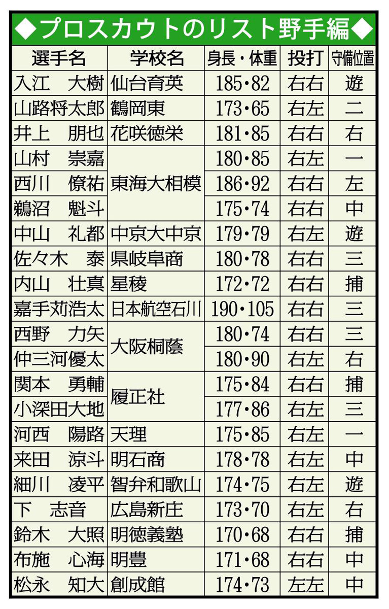 センバツ用にプロ作成「極秘指名リスト」一挙公開【野手】