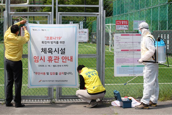 新型コロナウイルスの感染拡大で一時閉鎖の通知を取り外すソウル東にある城東区サッカー場関係者(C)ロイター
