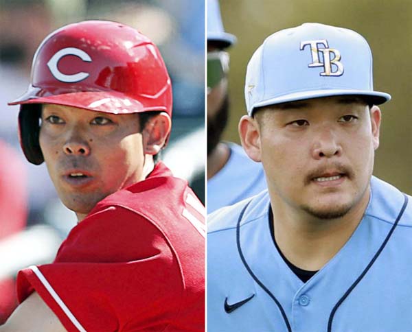 レッズの秋山(左)とレイズの筒香(C)共同通信社