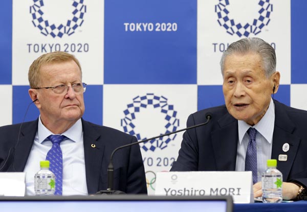 「再延期のプランはない」とコーツ調整委員長(左、右は東京五輪組織委員会の森喜朗会長)/(C)日刊ゲンダイ