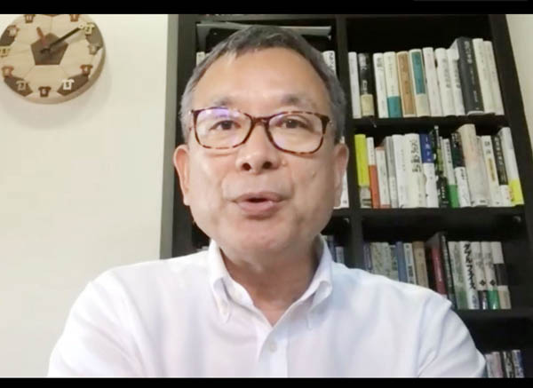オンラインで行われた合同記者会見で発言するJリーグの村井満チェアマン(C)共同通信社