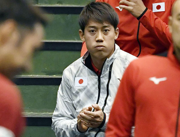 3月のデ杯で同僚の試合を見る錦織圭(C)共同通信社