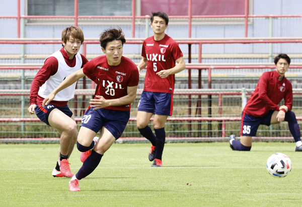 再開した全体練習で体を動かすJ1鹿島・三竿(手前)ら(C)KASHIMA ANTLERS