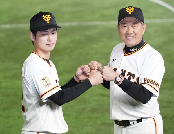 原監督(右)とグータッチをする沼田(C)共同通信社