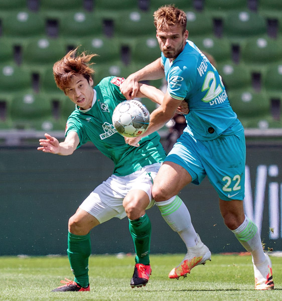 ボールを奪われる大迫(左)/(C)共同通信社