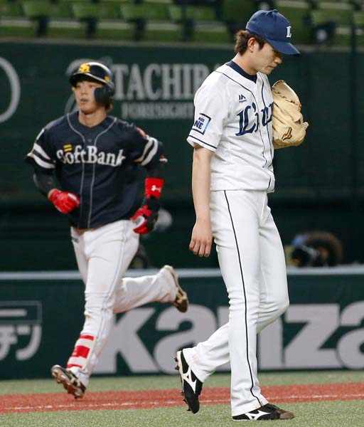6回、ソフトバンク・今宮(左)に逆転3ランを浴びた西武・今井(C)共同通信社