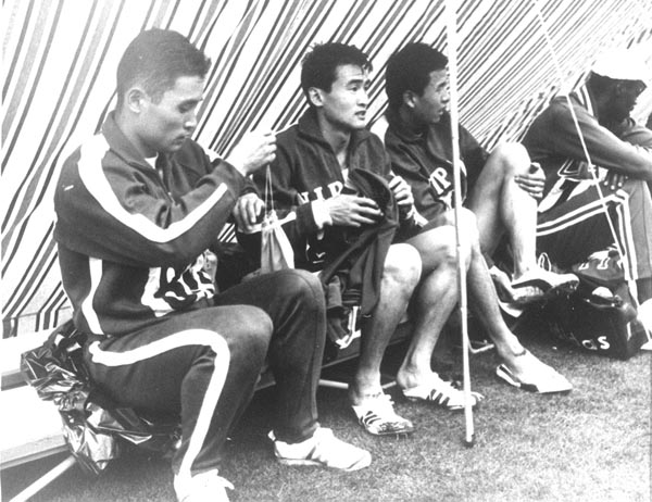 テントの中で東京五輪の出番を待つ山田宏臣(左3)/(C)共同通信社