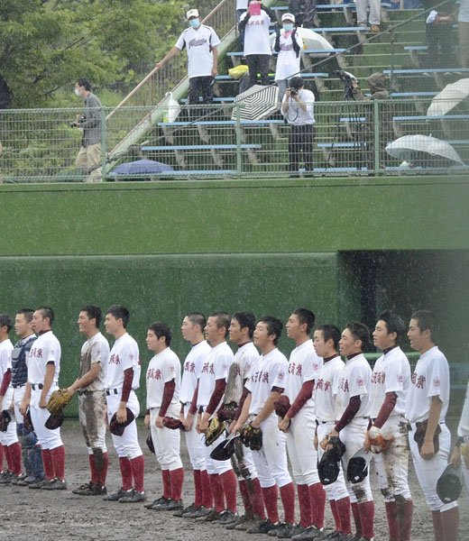 雨の中、校歌を歌う水沢商ナイン(C)共同通信社