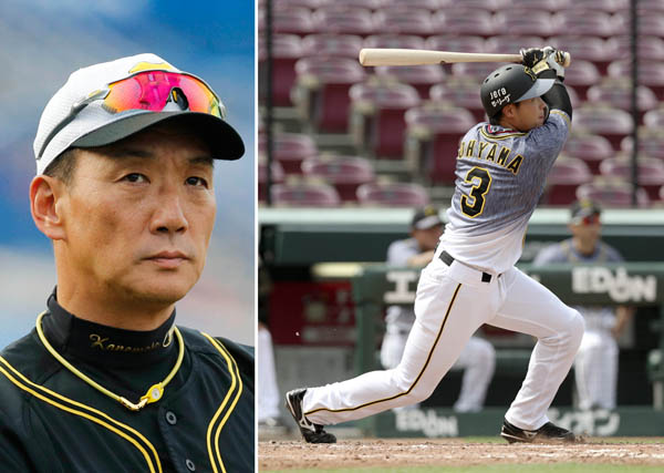5日の広島戦は2試合連続弾の大山(金本前監督=左)/(C)共同通信社