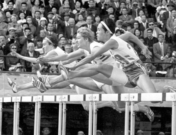 1964年東京五輪女子80メートル障害準決勝、第2ハードルを越える依田郁子(右端)/(C)共同通信社
