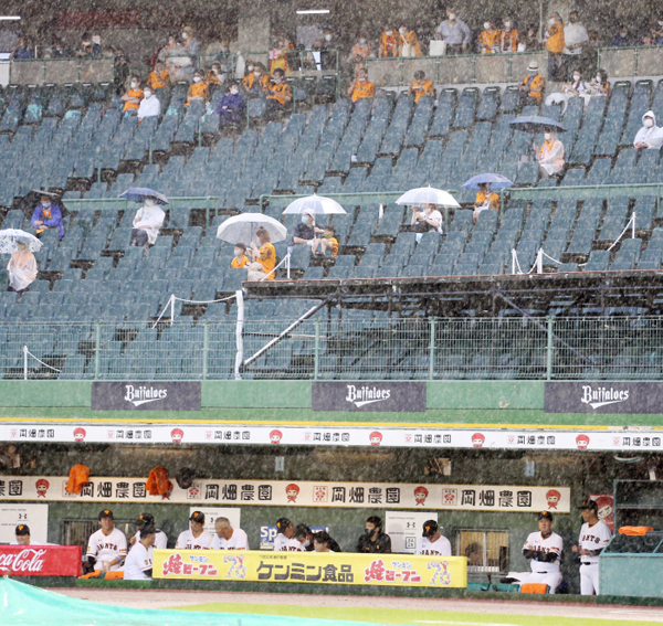 大雨の中、試合開始を待つ巨人ベンチ(右から2番目が原監督)と観客(C)日刊ゲンダイ