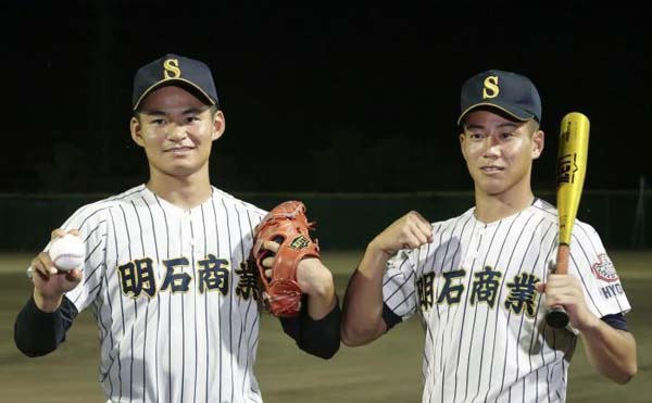 8日の抽選会後にポーズを取る明石商・中森(左)と来田(C)共同通信社