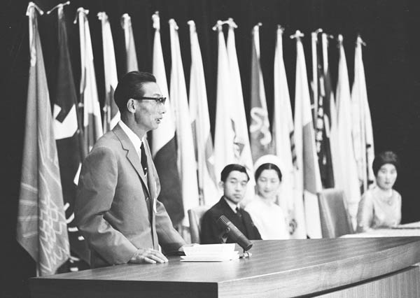 皇太子ご夫妻と秩父宮妃殿下が出席された東京五輪の日本選手団結団式で挨拶する大島鎌吉団長(C)共同通信社