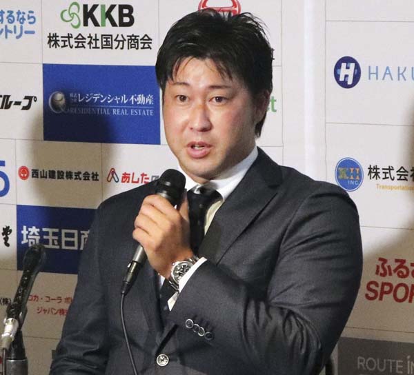 BCリーグ埼玉に迎えられて会見する田沢純一(C)共同通信社