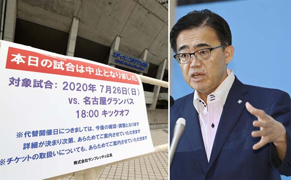 26日、J1名古屋で新型コロナウイルスの感染者3人が確認され、広島戦の中止を知らせる張り紙(右は会見する愛知県の大村知事)/(C)共同通信社