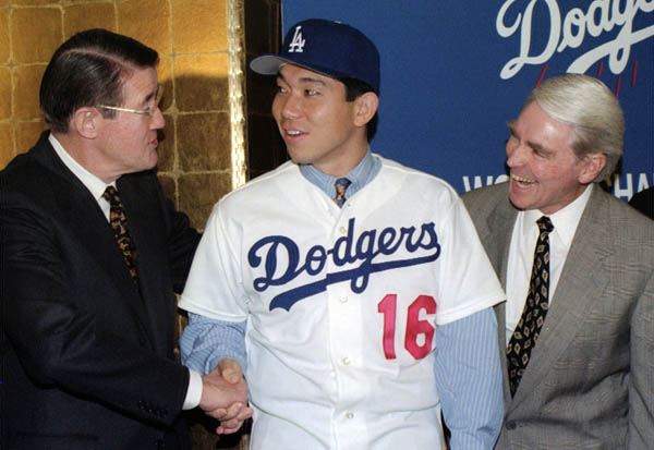 1995年2月、ドジャース入団発表の野茂英雄投手(C)共同通信社