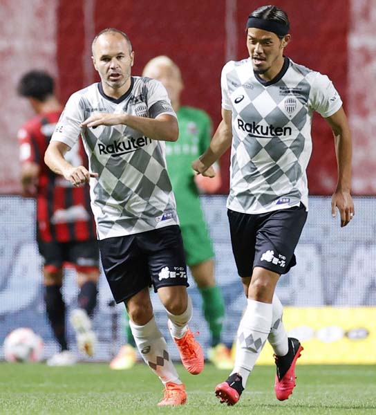 札幌戦でゴールを決めた神戸MF山口(右)を祝福するMFイニエスタ(C)共同通信社